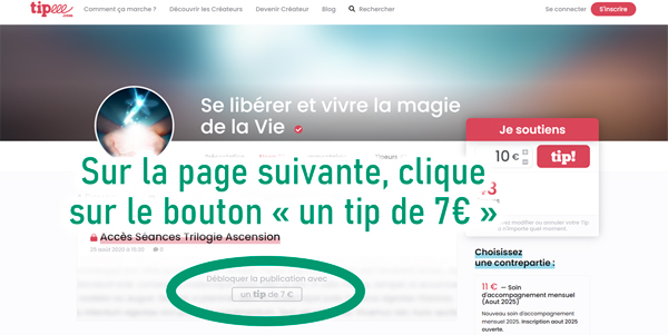 ℹ️ Pour accéder à ton pack “Trilogie Ascension”, clique ci-dessus sur le bouton bleu, cela ouvrira le paiement sur la plateforme Tipeee. L’image ci-dessous te montre où cliquer sur la page qui va s’ouvrir. Une fois ta contribution effectuée tu recevras une confirmation par email et l’accès à la séance et à ton bonus offert.